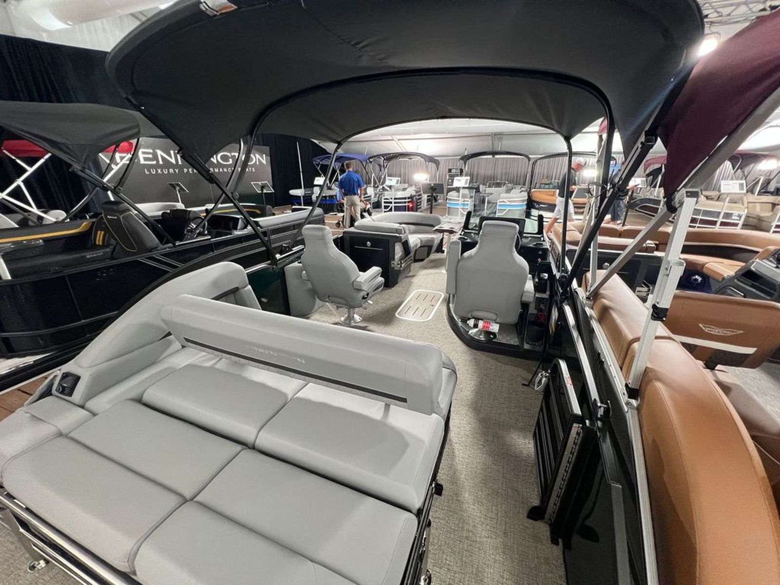 This model stands out with the bold Blackout Luxe Package, featuring black luxe logos, a black rub rail insert, and a sleek, modern profile that demands attention. The electric power curved bimini top adds both style and convenience, providing shade instantly at the push of a button.