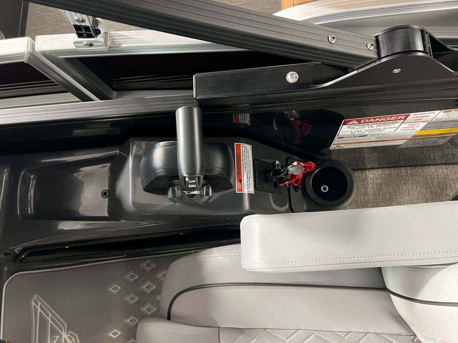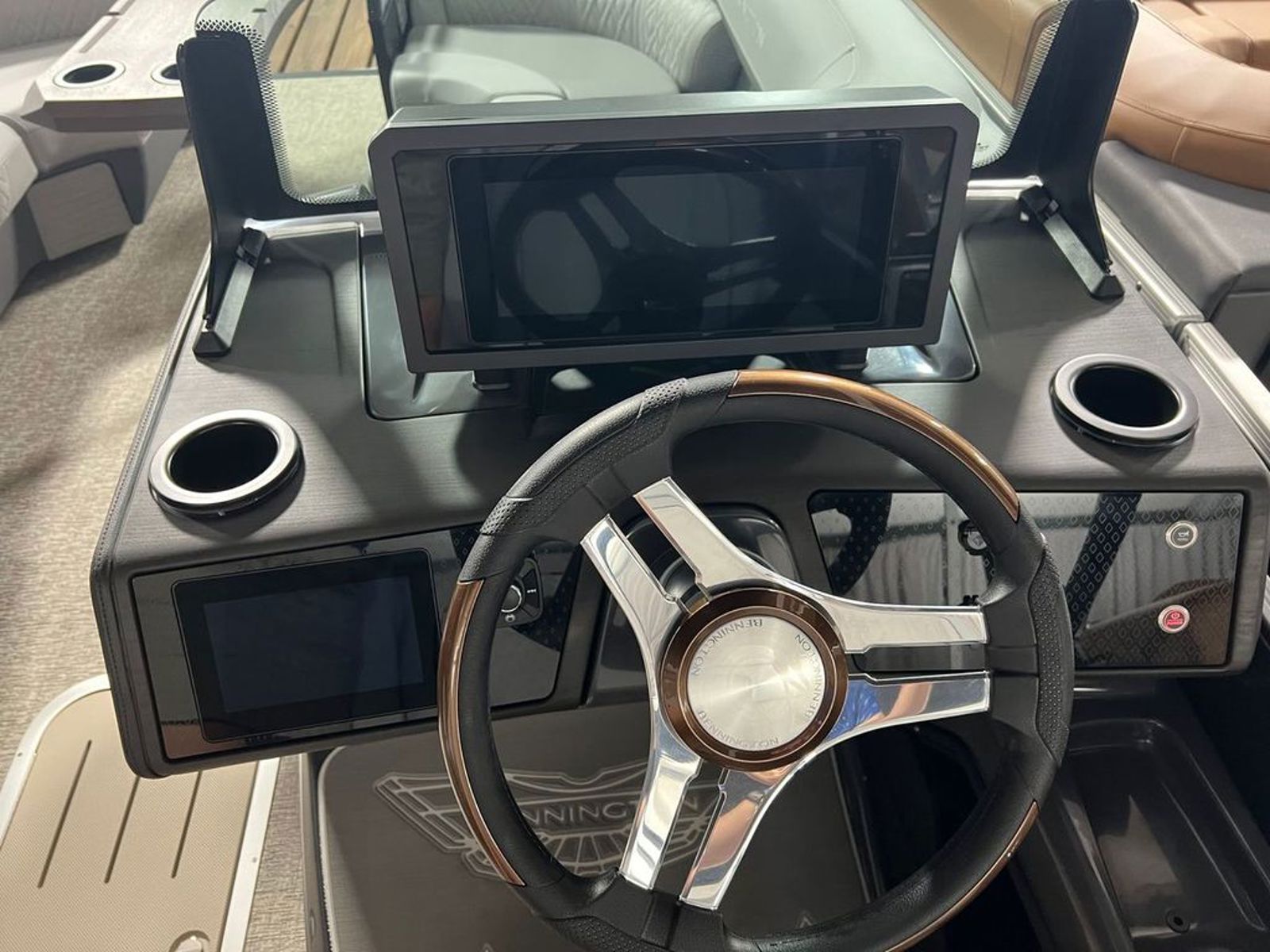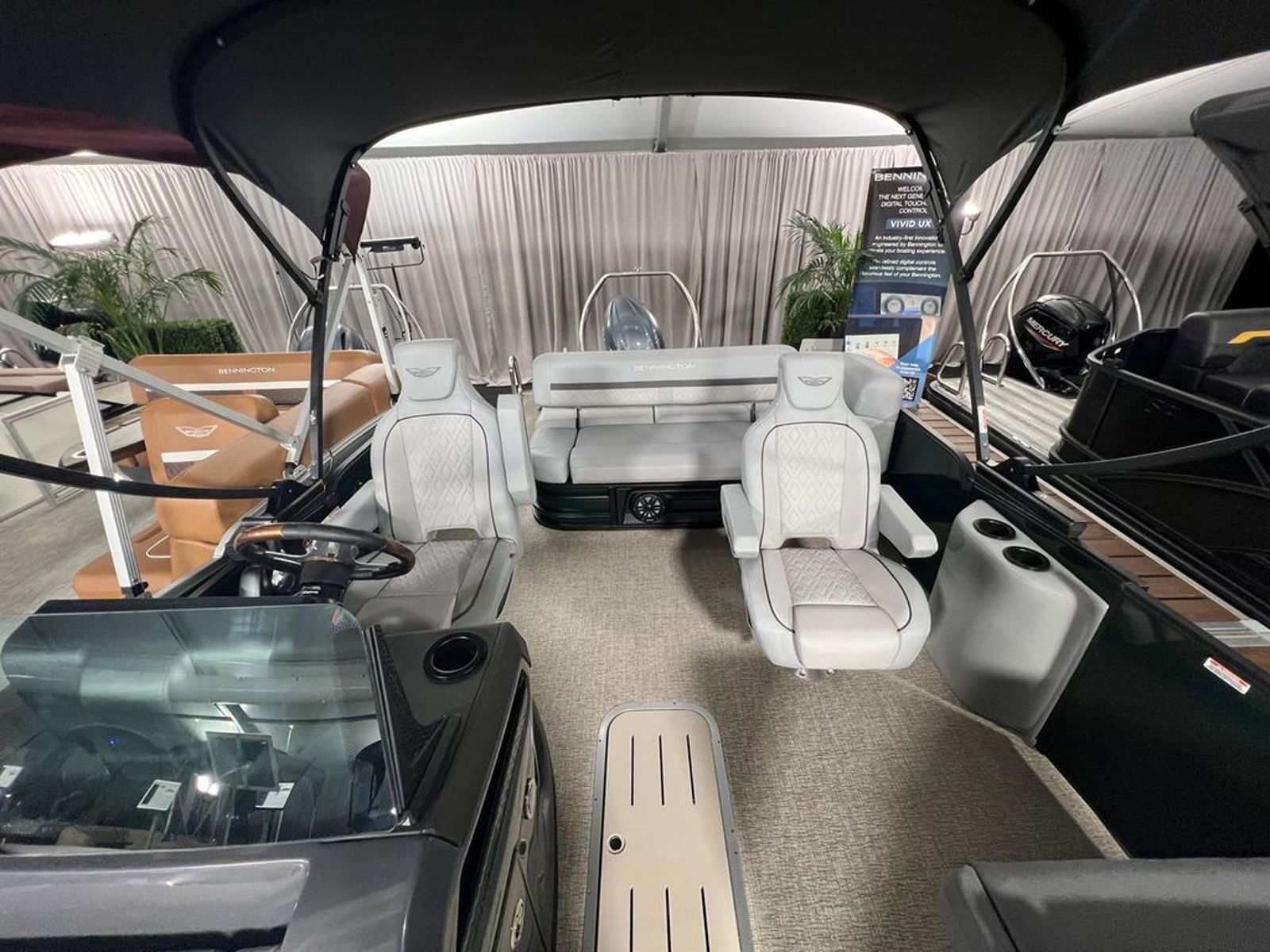 At the helm, you’ll find premium technology including a 12” Vivid UX touchscreen display and a 7” Garmin multifunction display, offering seamless control, navigation, and system integration. The master power panel with horn, USB ports, and wireless charging dock keeps everything easily accessible and connected.