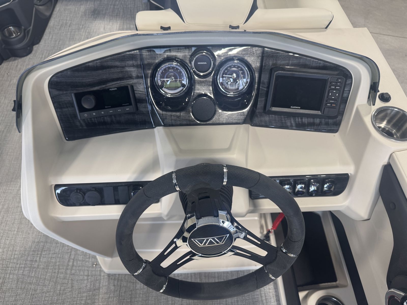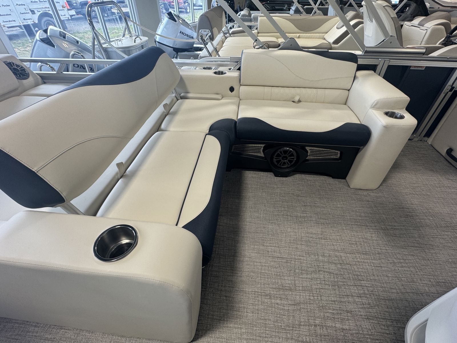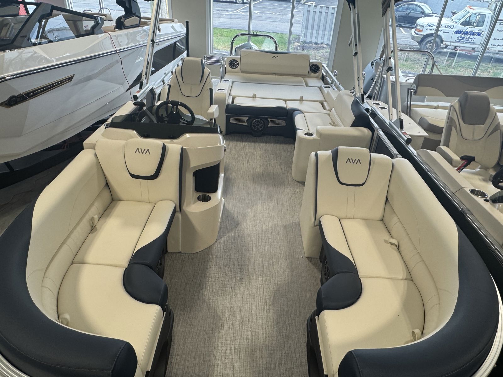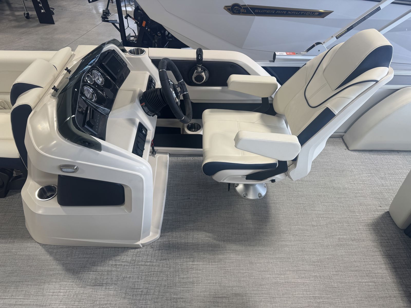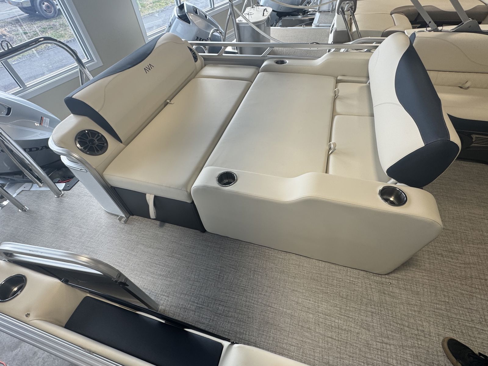 Designed for comfort, this model features Cream White vinyl seating with navy accents and charcoal seat cladding for a refined, high-end feel. The Riptide Shadow flooring adds durability and style, while the Platinum Edition package enhances fit, finish, and overall luxury throughout.