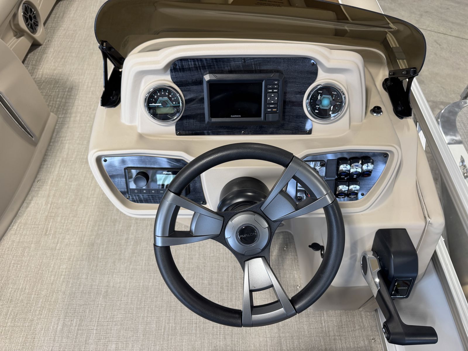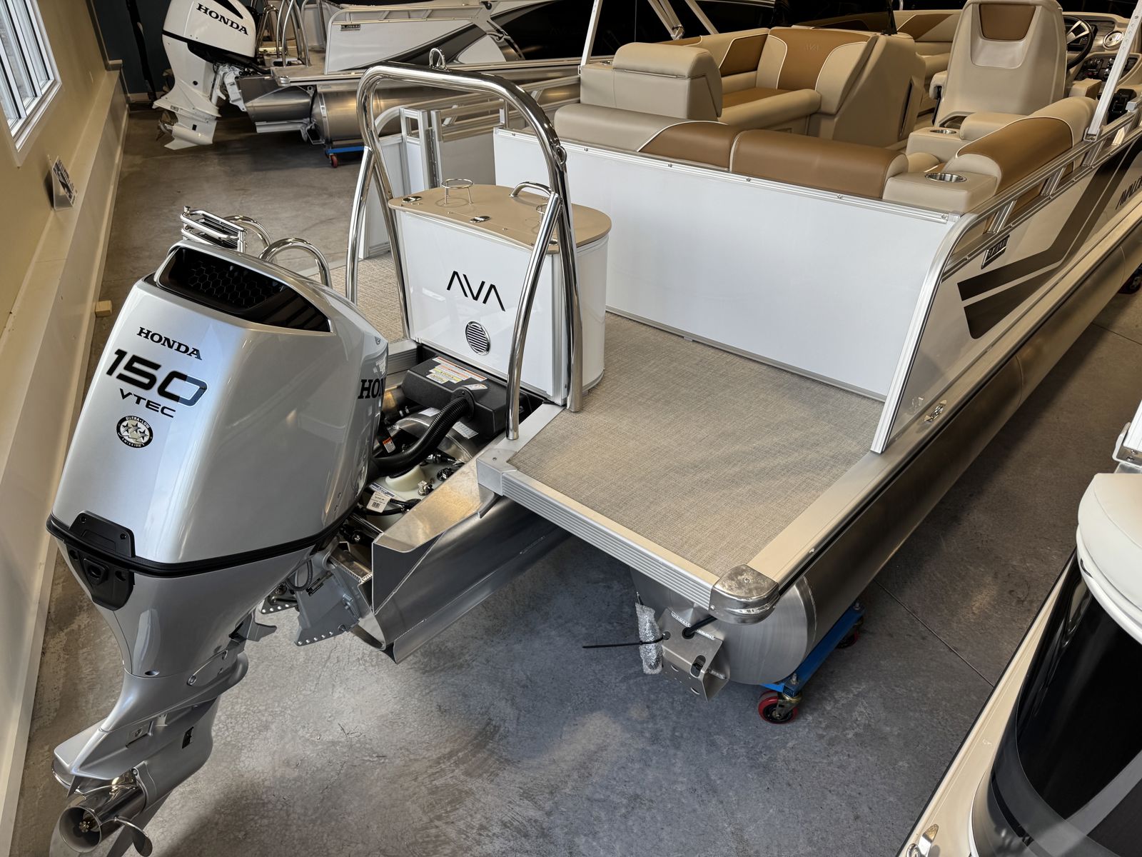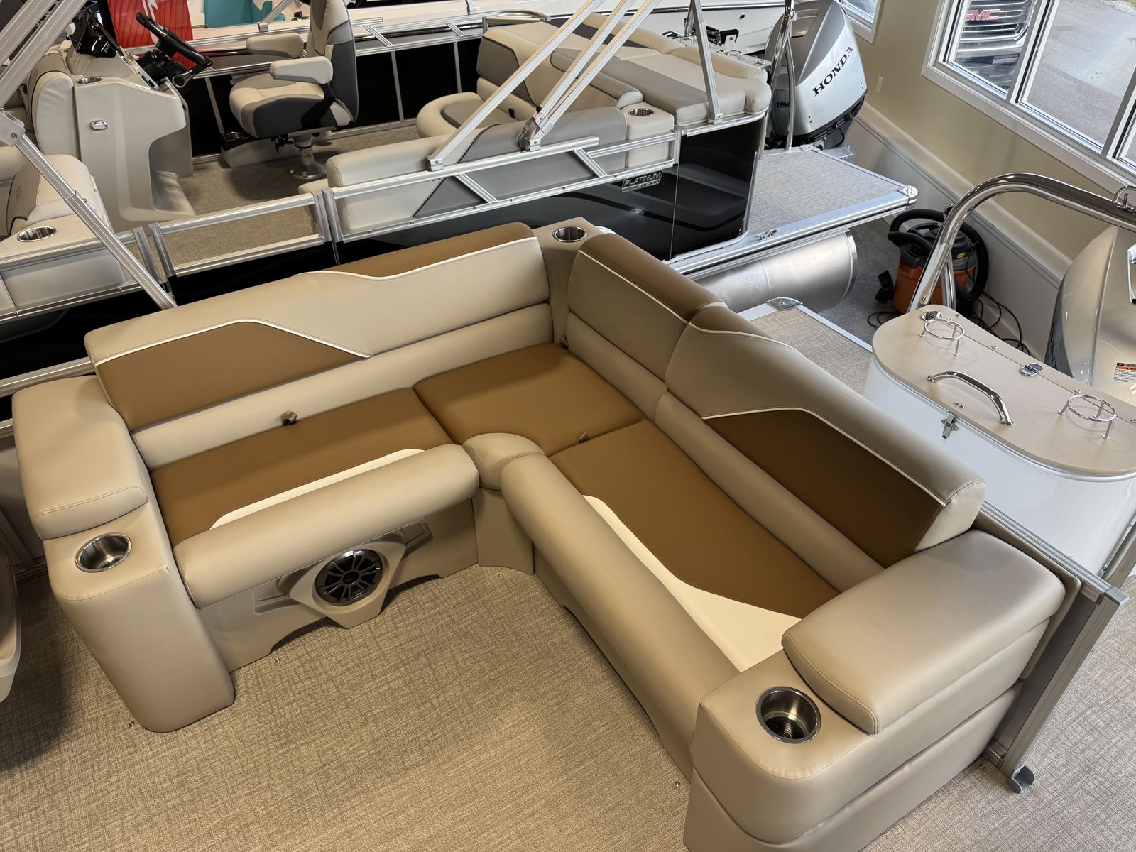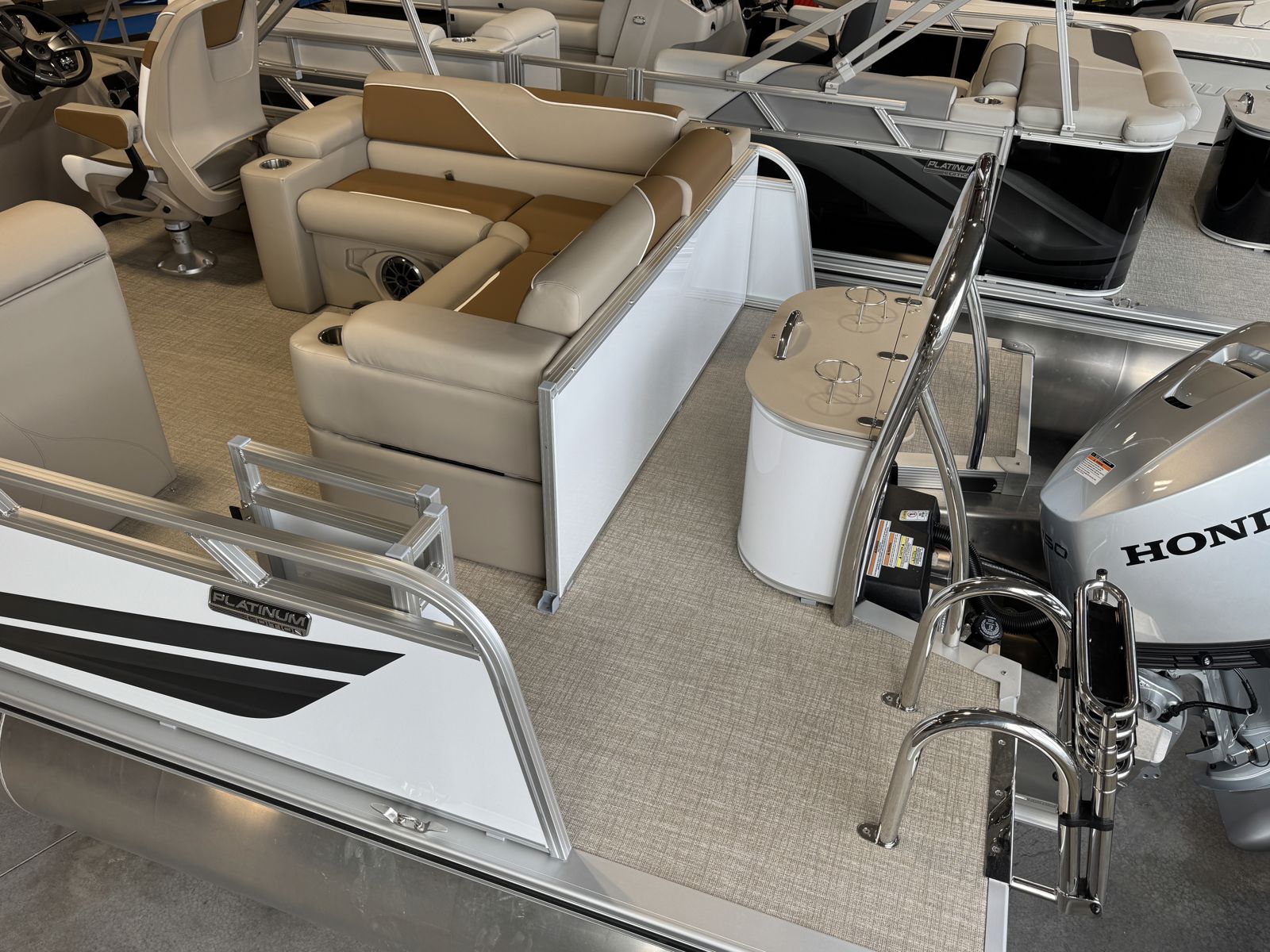 Powered by a Honda BF150 150HP outboard with Honda pre-rig, this boat offers smooth, reliable performance. The Sport Performance Tritoon Package enhances stability, handling, and overall ride quality, making it ideal for cruising and light watersports.