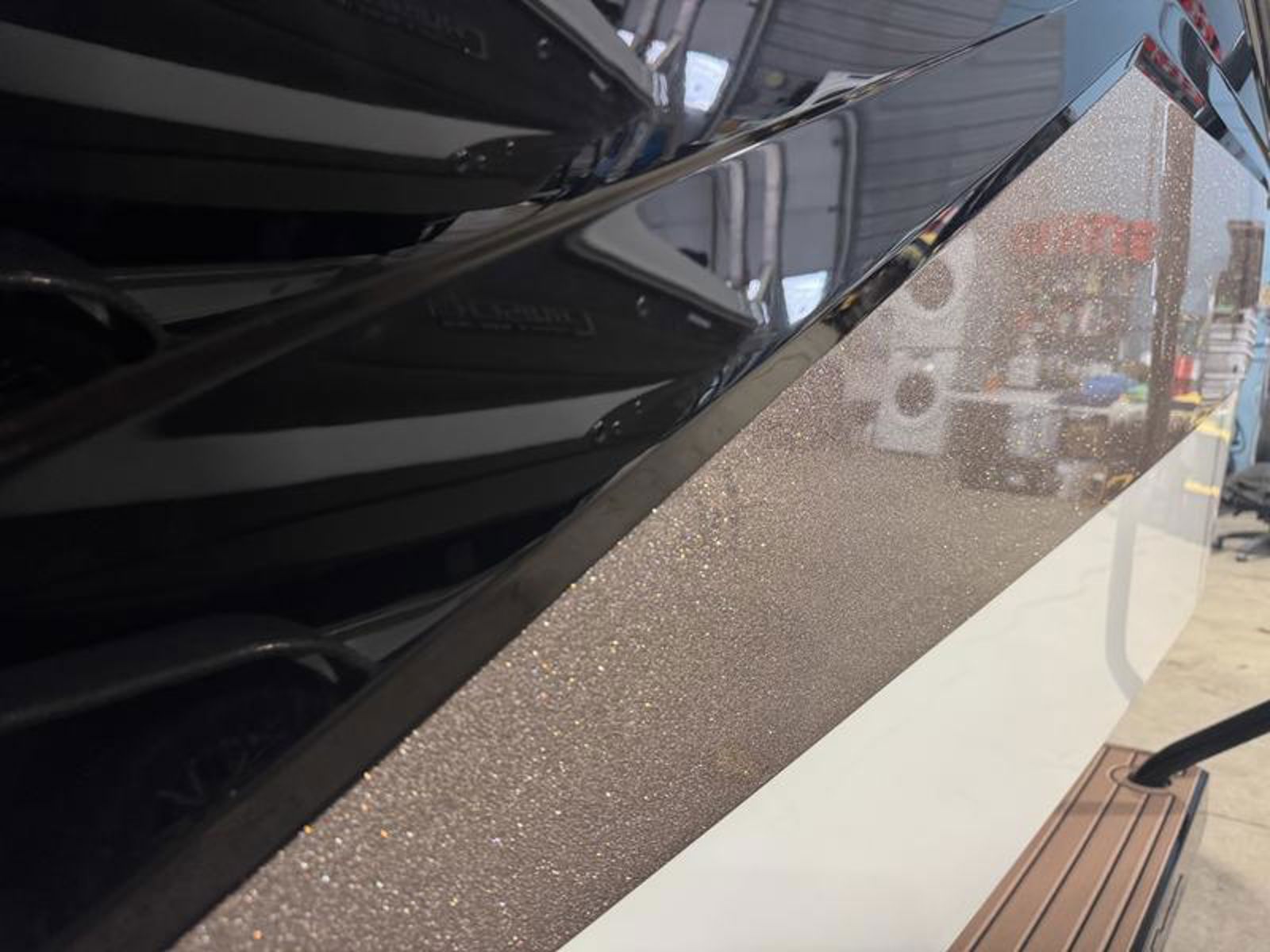 The sleek exterior showcases molded-in gelcoat graphics, stainless steel accents, and a swim platform with Sof-Trac mat and flip-down swim step. Additional features like fender clips, midship cleats, LED transom lighting, and an anchor locker enhance both functionality and style. Wakeboard racks and a stainless steel ski pylon make it ready for any watersport.