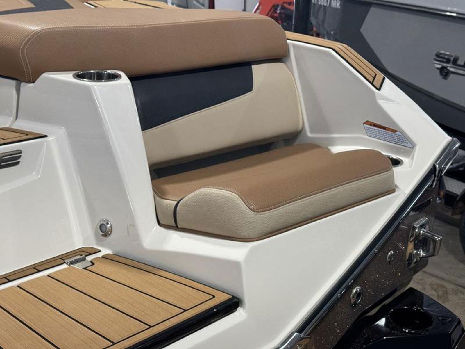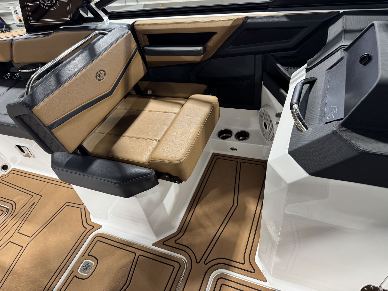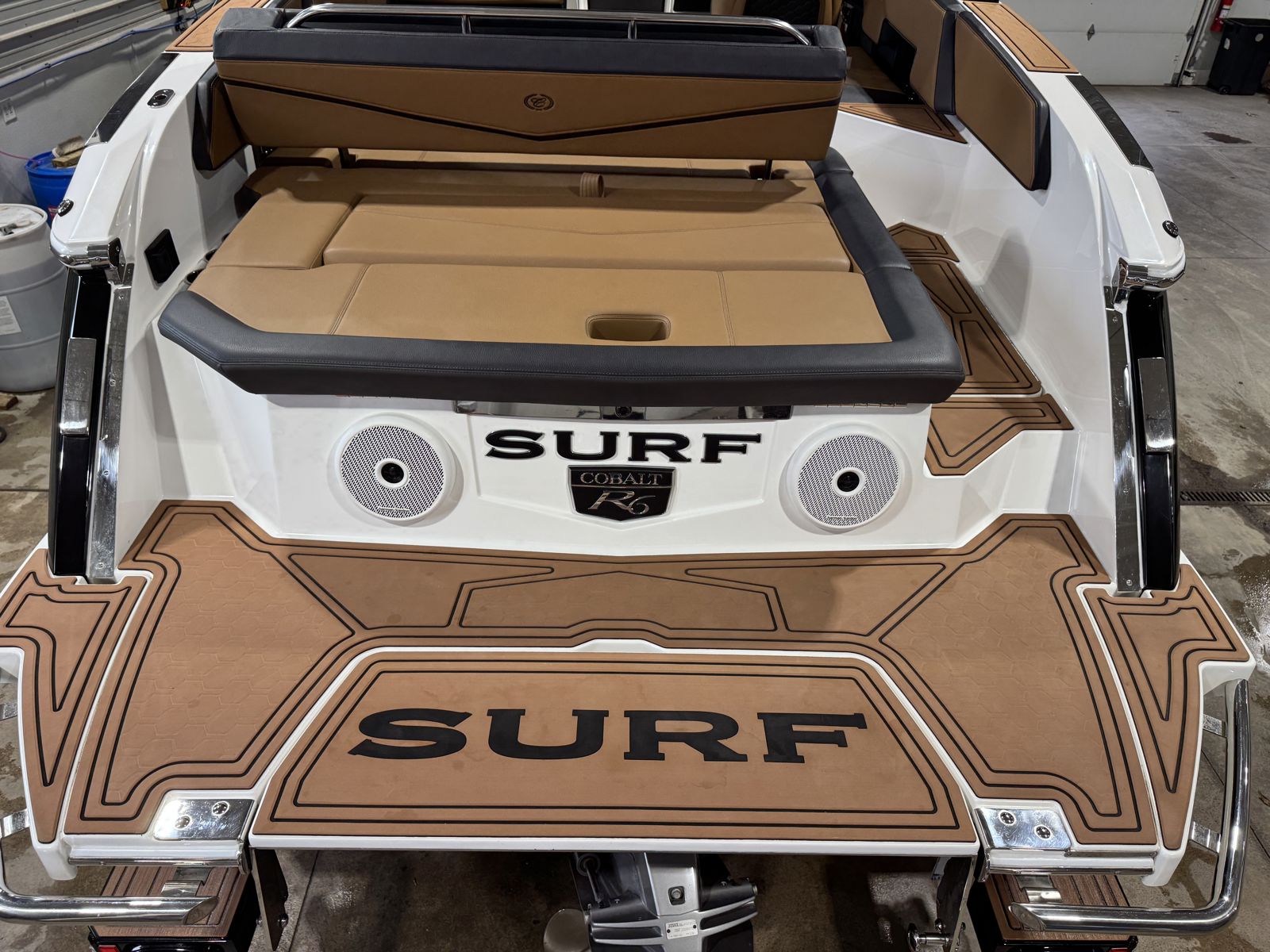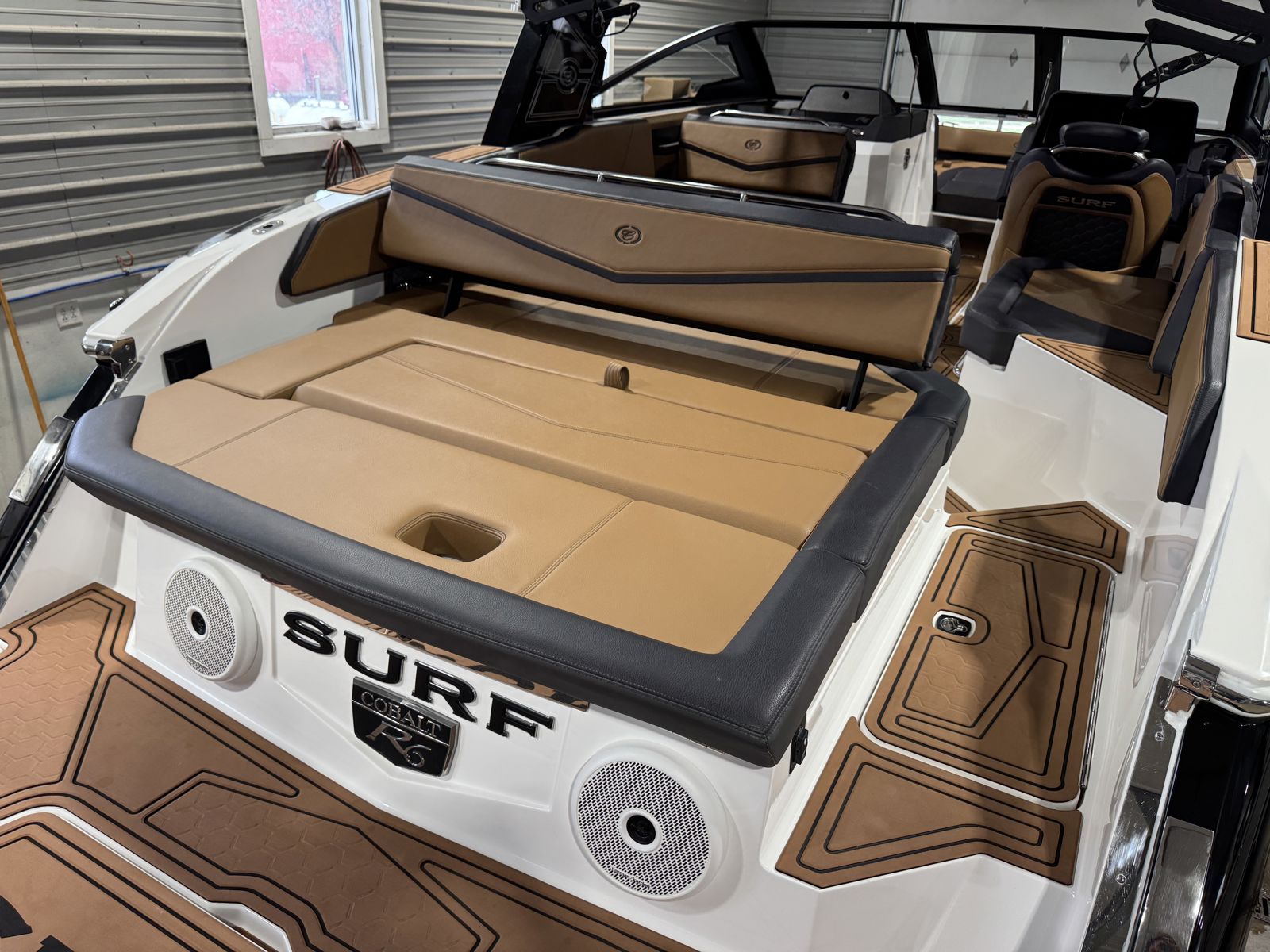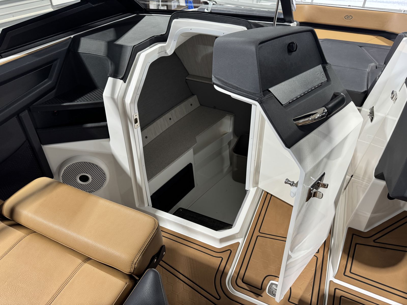 Inside, the R6 Surf offers wraparound yacht-style seating with Varadense Comfort cushioning and a convertible sundeck lounger. Thoughtful features like a flip-back passenger seat, aft-facing rumble seat, removable cooler, and dedicated trash receptacle make it ideal for entertaining. A head compartment with porta potti adds convenience for longer days on the water.