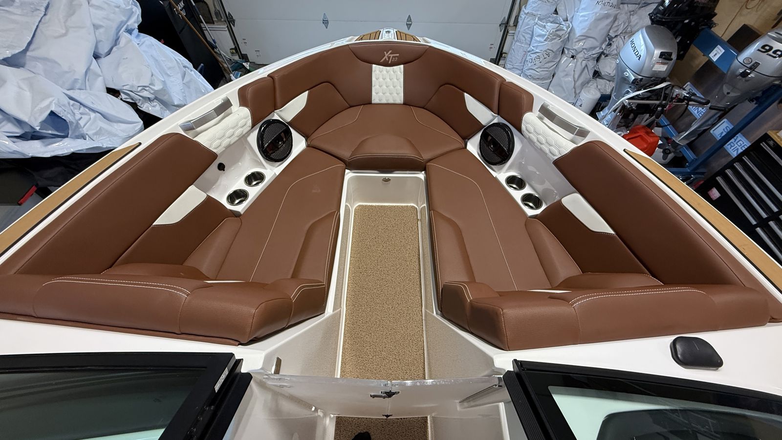 Inside, the XT23 offers plush, ergonomic seating with room for up to 16 passengers. Features like convertible rear seating, flip-up transom backrests, and a starboard pop-up seatback enhance versatility and comfort. The open bow and spacious cockpit layout create an ideal environment for relaxing, entertaining, and enjoying time on the water.