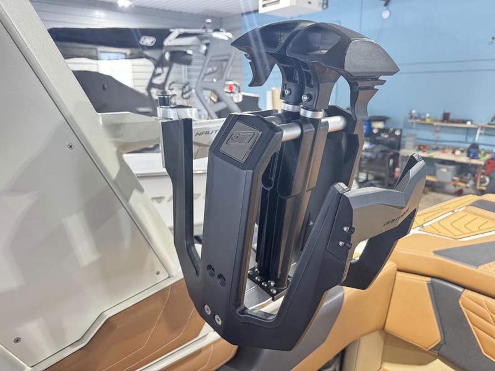 The Super Air Nautique S23 has three different tower options for 2023. It comes standard with our Flight Control Tower, which manually folds down or up for storage or getting under bridges. You can also opt up to the Actuated Flight Control Tower which folds up or down at the touch of a button. Step up to the Telescoping Flight Control Tower, and you can quickly and easily telescope the tower up or down with everyone sitting comfortably in their seats. The Telescoping Flight Control Tower is designed so that the boat can be in motion with the tower completely up or completely down and the bimini remaining in place for maximum protection from the elements.