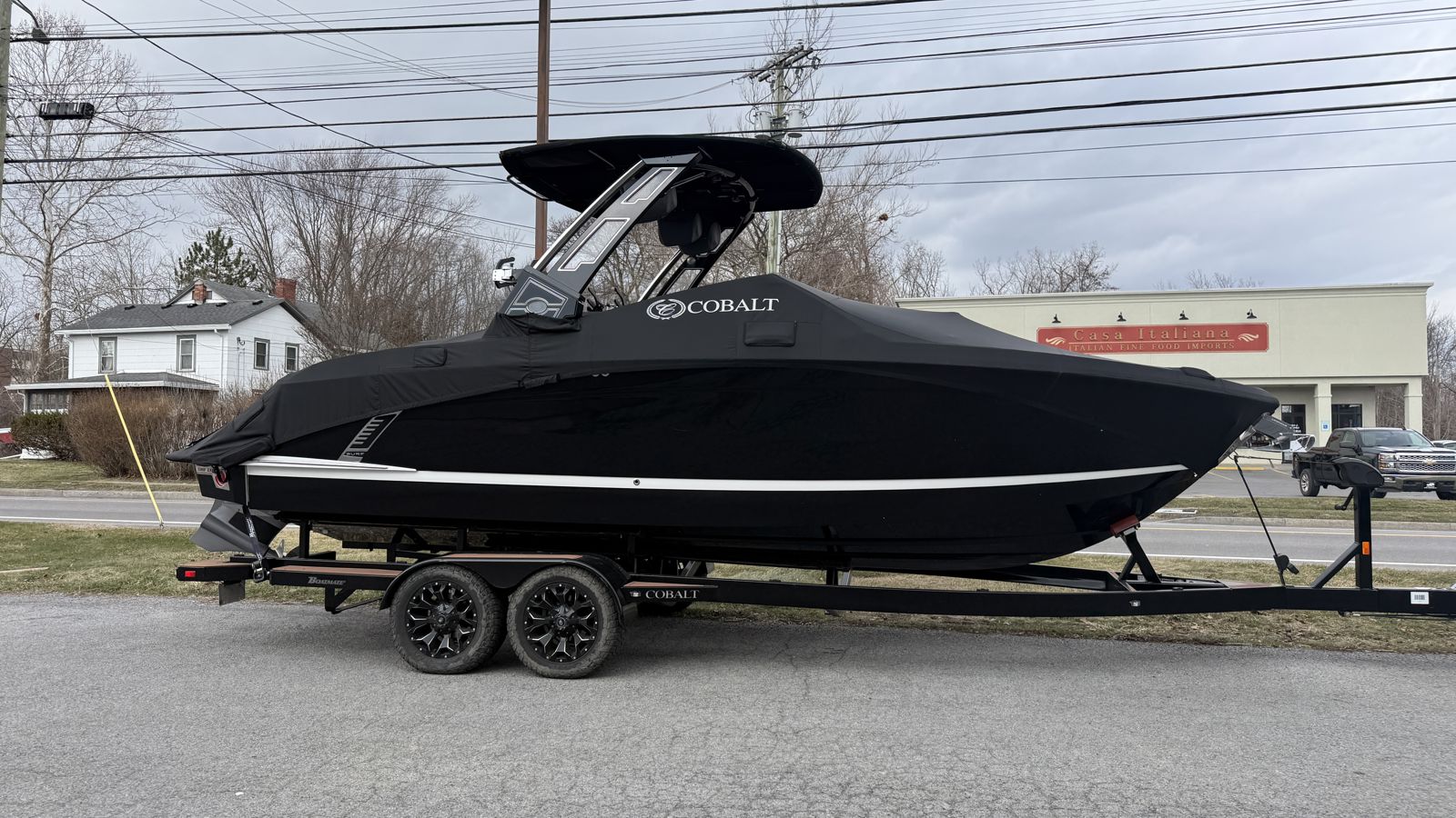 The Alpha M2 tower features swivel board racks for easy gear access and storage, while the Bimini top provides shade for long days on the water. A tandem axle Tige trailer is included for easy transport, and a full cover helps protect the boat when not in use. The port-side walkthrough adds convenience when moving from cockpit to swim platform.