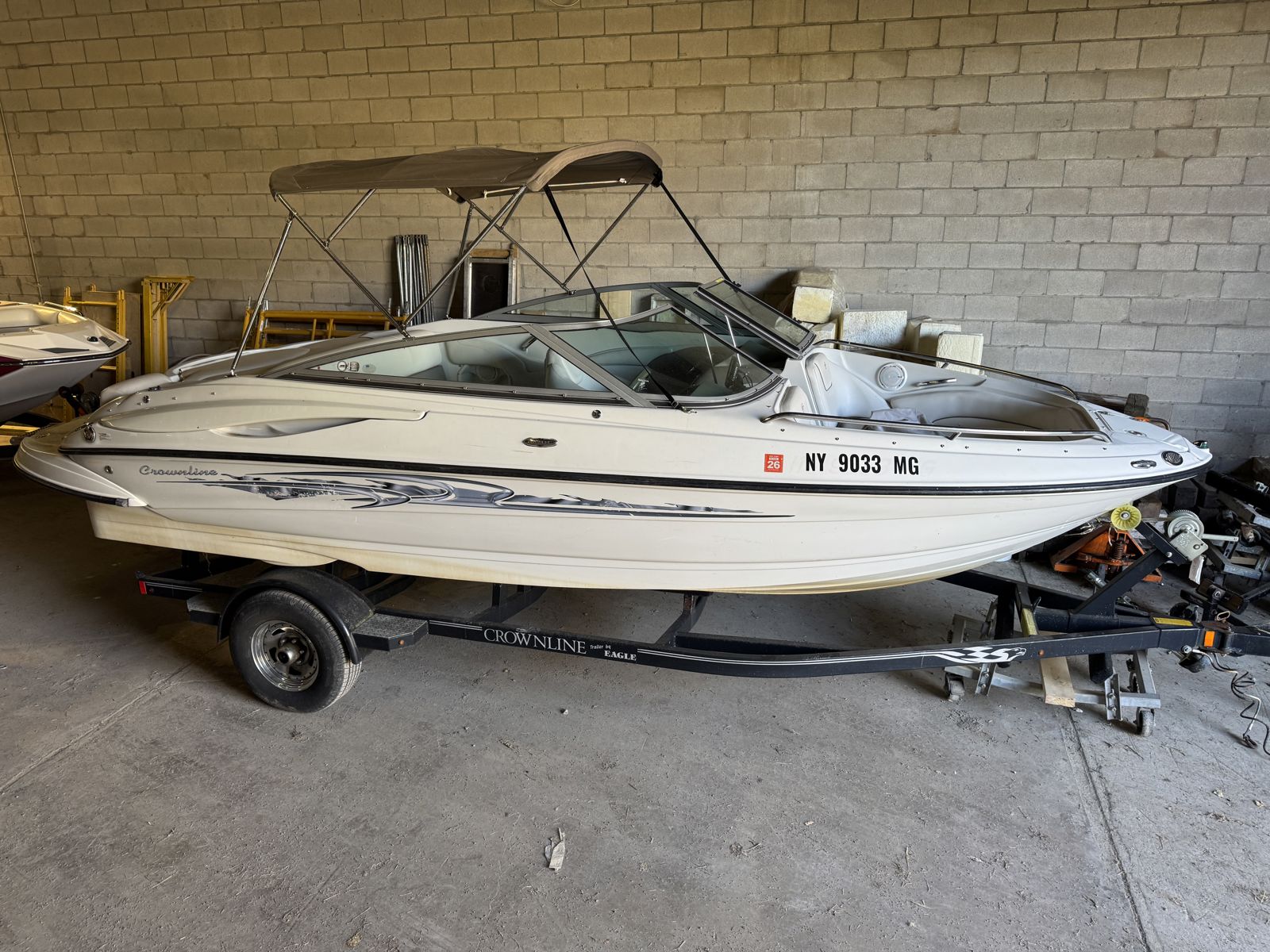 A Bimini top provides shade on sunny days, while the sleek Crownline design and low-profile windshield give it a sporty, timeless look. Includes a single axle trailer for easy transport and storage.