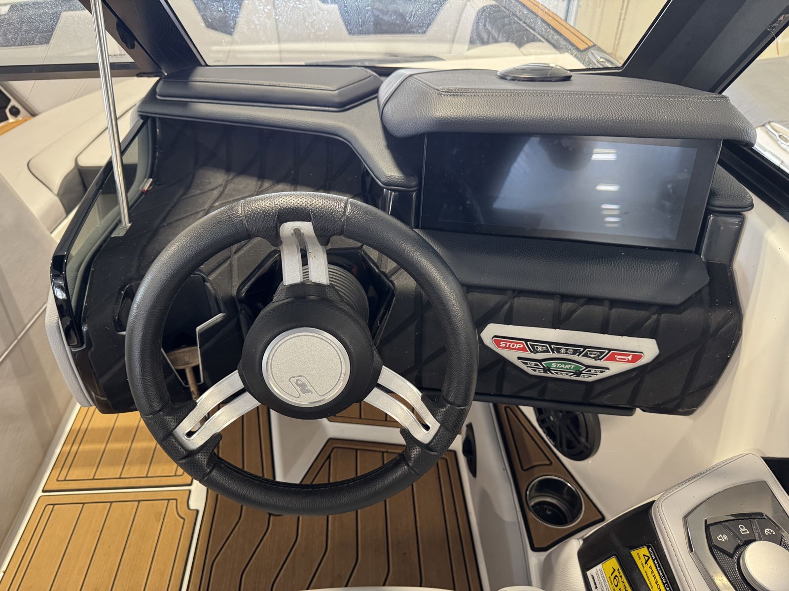 Stay connected with a Bluetooth sound system, multiple speakers, USB/MP3 inputs, and a dash-mounted stereo remote. The helm features a gloss black dash, illuminated stainless steel switches, depth and water temp package, and a premium leather/stainless steering wheel for a refined driving experience.