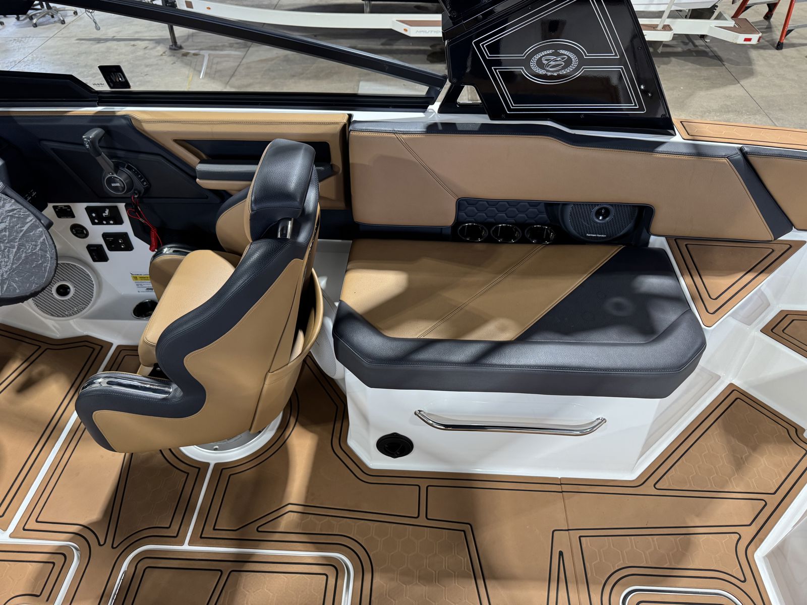 The Super Air Nautique S23 takes on the same asymmetrical design that Nautique has been known for. Clear visibility of all your instrumentation is to the right of the steering wheel with the LINC Panoray touchscreen perfectly in view, while also keeping everything the driver needs within reach. A phone pocket doubles as a place to keep your drain plug when your boat is out of the water, and a large open dash area is the ideal place for hats and other accessories.